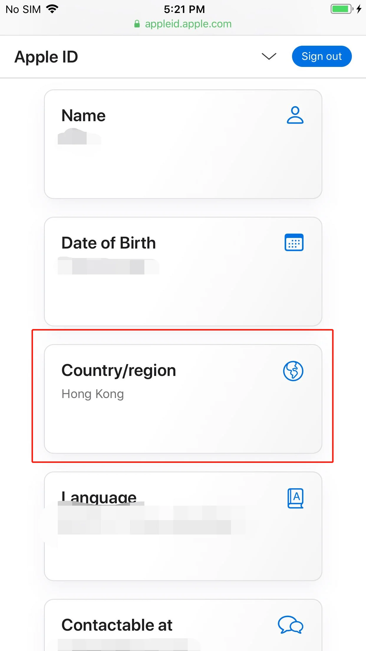 Select "Country/Region" at the personal information page. Enter your Apple ID and Click "Sign in".